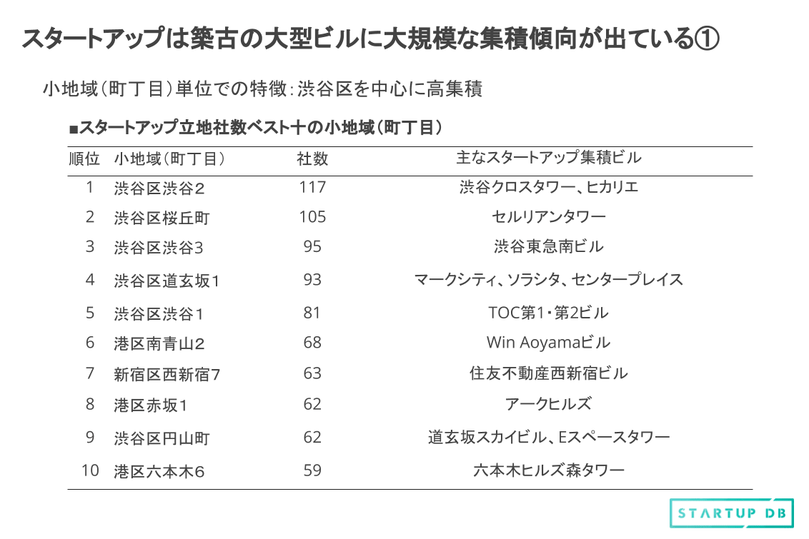 ・スタートアップは都心のごく限られたエリアに立地:都心エリアに強い集積(グローバルモランIは0.6)。特に渋谷・赤坂・六本木では、ビル単位で高度に集積(ロンドン、ボストンと似た傾向)。