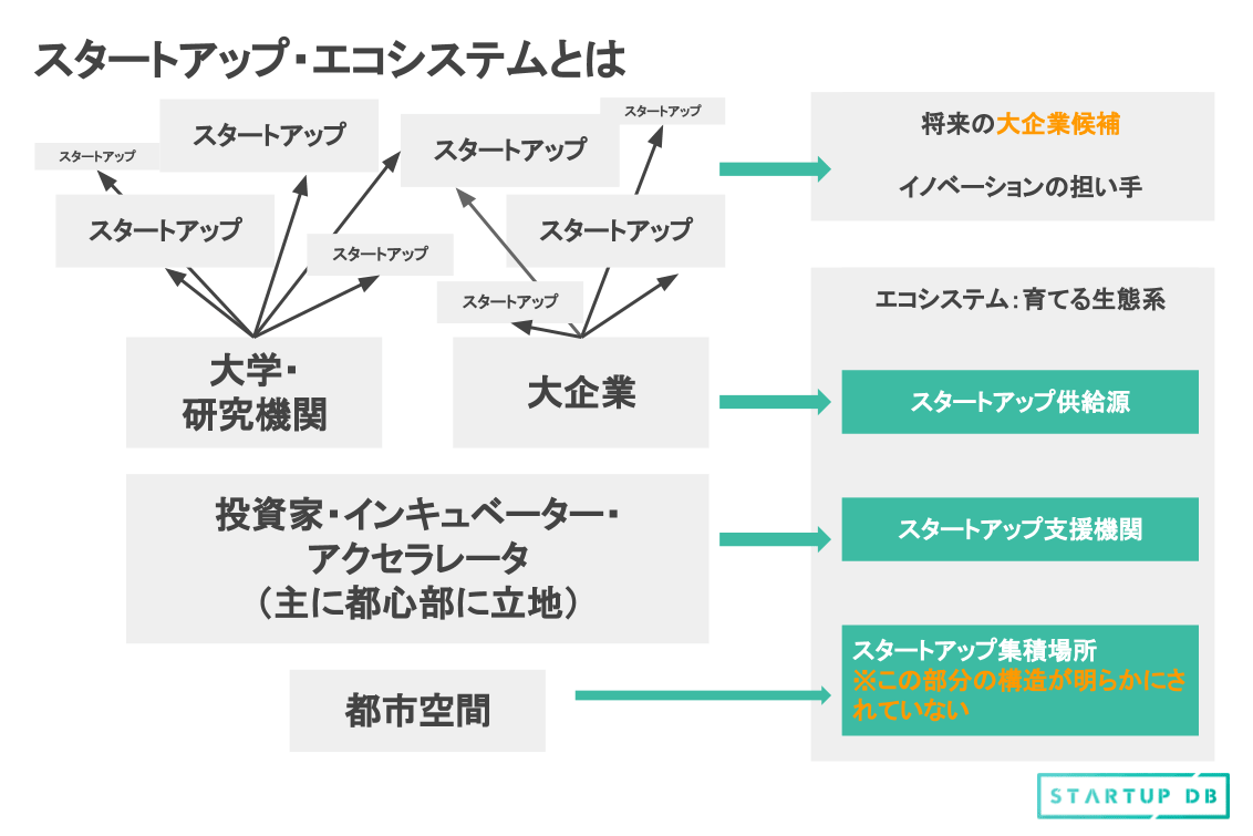 ・エコシステムは、スタートアップとそれをサポートする支援機関によって構成されている。支援機関は、資金提供ばかりではなく、経営ノウハウ、客先の紹介、人材紹介など総合的なサポートを行う。
