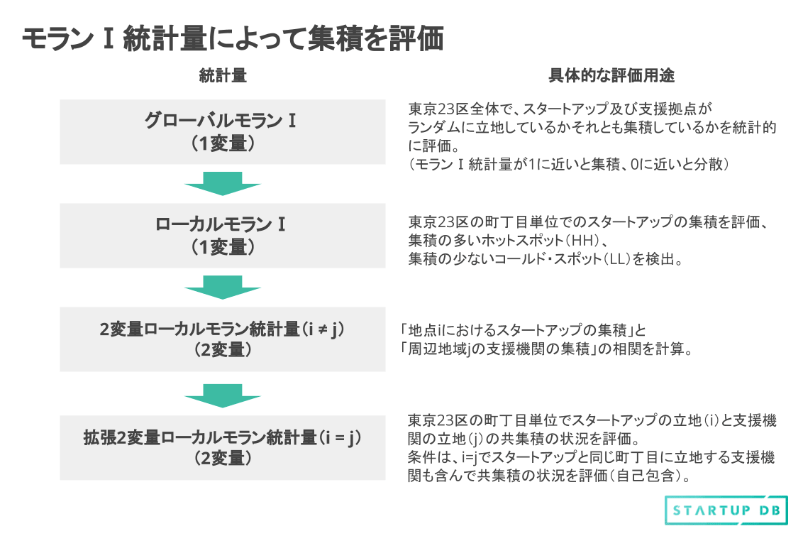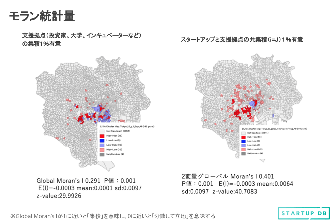 ・独自性:拡張2変量ローカルモランによってエコシステムのコミュニティの共集積の状況を空間的に可視化した。また、エコシステムが不足しているエリアの抽出も行った。企業の立地を可視化した研究は多いが、エコシステムの構造を可視化した研究は少ない。