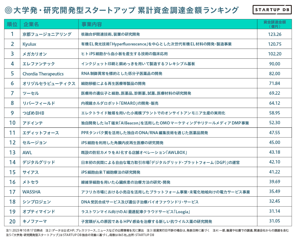 2位は次世代有機EL材料の開発に取り組む九州大学発スタートアップ・Kyulux。累計調達額は120億7,500万円だった。2023年3月にJST(国立研究開発法人科学技術振興機構)の「A-STEP 実装支援 (返済型)」に採択されたと発表したほか、9月には香港を本拠地とする投資運用グループの運営する「九州発ジャパン・エボリューション・ファンド」から2億円を調達している。