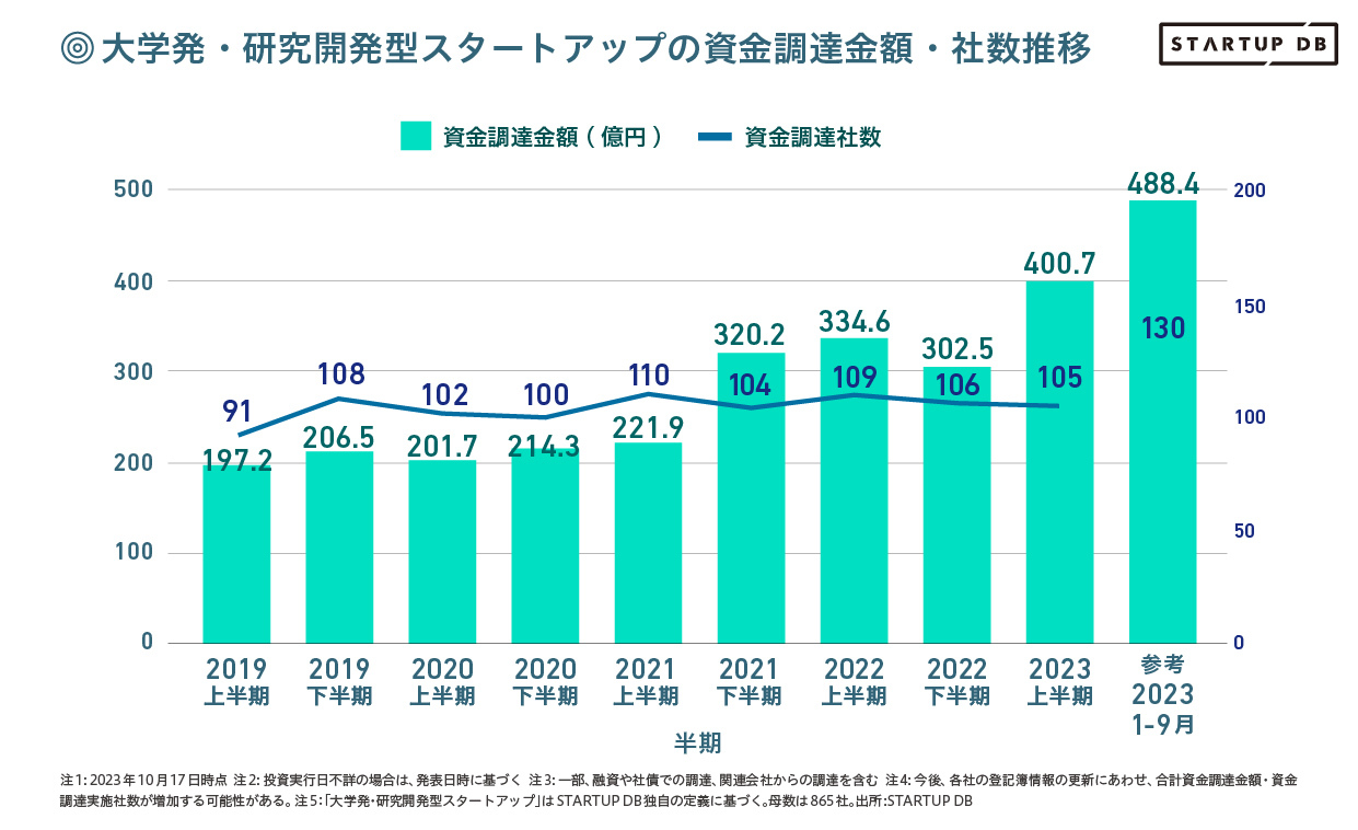 国内では資金調達環境の冷え込みを受け、投資先の厳選が進んでいるとの指摘もある。また、2023年はIPO市場も活況とは言い難く、大きな事業スケールを期待できる大学発・研究開発型スタートアップに投資家の注目が集まっている可能性がある。