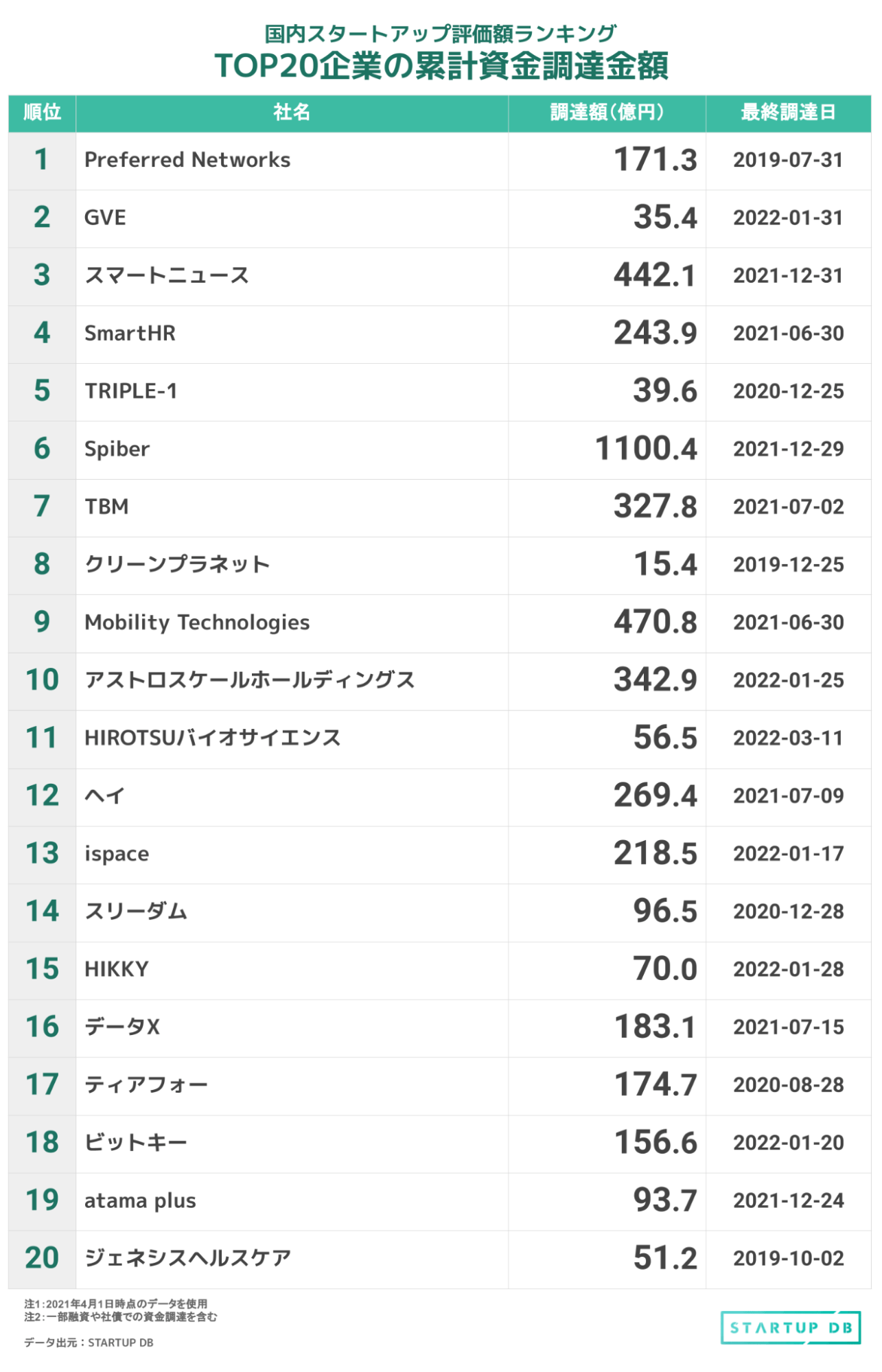評価額ランキング上位企業のうち、GVE、HIROTSUバイオサイエンス、ispaceの3社が先月よりも累計資金調達金額を伸ばしている。GVEは、2021年3月から2022年1月にかけて3回の資金調達を登記簿で確認し、累計資金調達金額は6億9,000万円上昇。HIROTSUバイオサイエンスは、2022年に2度の資金調達を新たに確認。累計資金調達金額が先月よりも4億1,000万円増加している。また、ispaceは過去の2021年10月における2億5,000万円の資金調達と、2022年2月における新株予約権の行使を確認。累計資金調達金額は、先月の216億円から218億5,000万円に増加している。