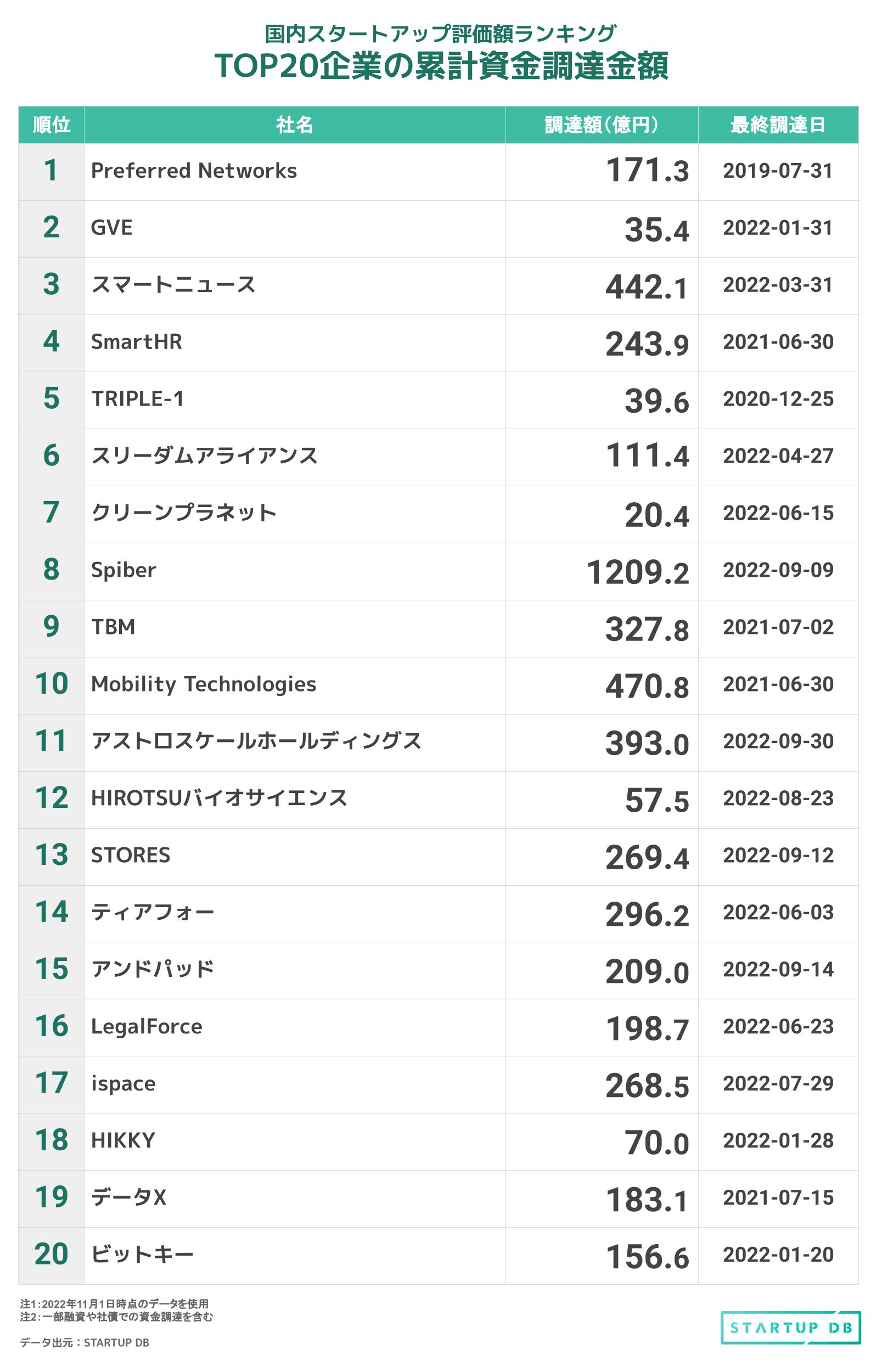 今月の評価額ランキングでは、上位20社の顔ぶれと順位に変化はなかったものの、9月末におけるTRIPLE-1による新株予約権の新規発行が確認され、評価額が先月の1,641億円から約9億円増加している。同社はブロックチェーン技術の1つであるマイニングに注目し、暗号通貨マイニング向けASICチップ「KAMIKAZE」などを開発・製造するスタートアップ。近年ではAIやローカル5G市場にも参入しており、2022年4月には、TRIPLE-1のローカル5Gネットワークと、FCNTのローカル5Gに対応したスマートフォン型デバイス間における相互接続性試験を完了。今後も日本国内のローカル5G市場の立ち上げと市場拡大に向け、共同実験や協業に注力していくことを発表している。