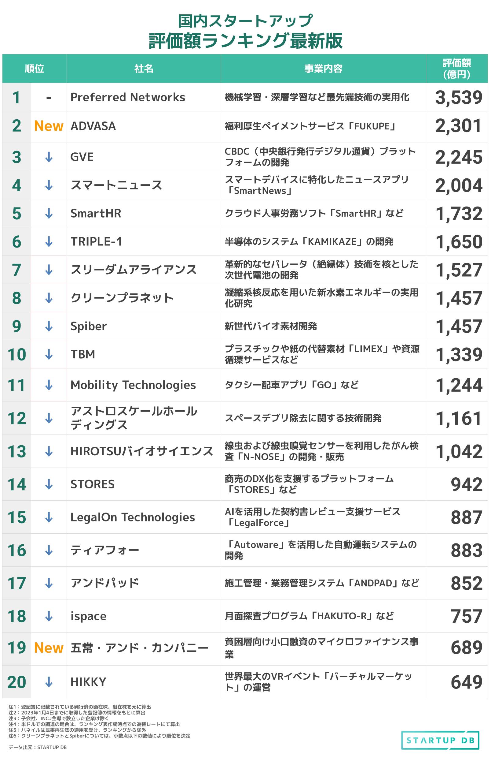 ランク圏外だったADVASAが、2023年1月時点で評価額2位に躍り出た。同社は1月6日、評価額2,000億円で資金調達を実施したと発表。STARTUP DBの調査では2,301億円となっている。調達額や出資元などは公表していない。