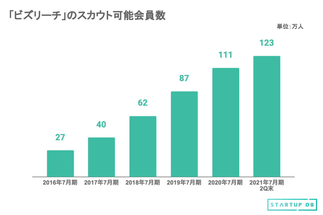図から、「ビズリーチ」の売上高は2018年7月期から2019年7月期にかけて約1.4倍、2019年7月期から2020年7月期にかけては約1.2倍と、着実な増加を見せている。