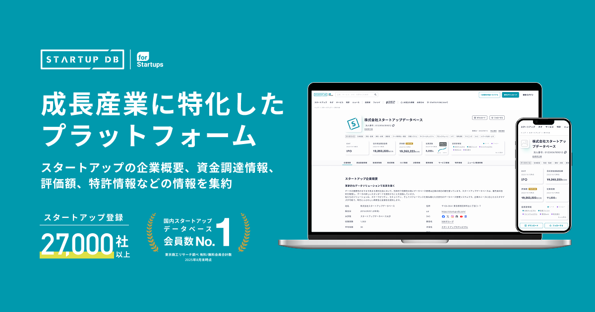 STARTUP DBは、成長産業領域に特化した国内最大級の情報プラットフォームです。27,000社以上のスタートアップ・ベンチャー企業のファイナンス情報や事業内容を網羅するほか、詳細な特許情報も閲覧頂けます。