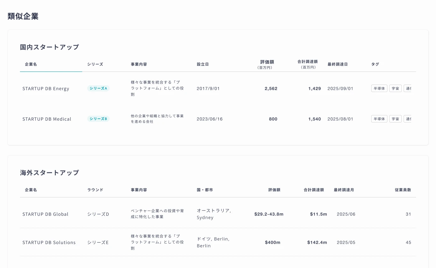 国内スタートアップページ・海外スタートアップページのいずれでも、国内/海外スタートアップを横断して類似企業を表示できるため、国内スタートアップへの投資・協業を検討する際に、類似する海外スタートアップの成長性や資金調達状況も踏まえながら、投資/協業の是非をより納得感を持って判断できるようになります。